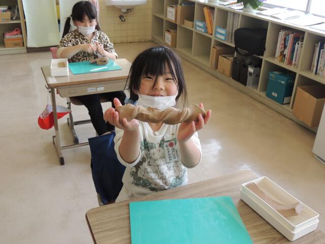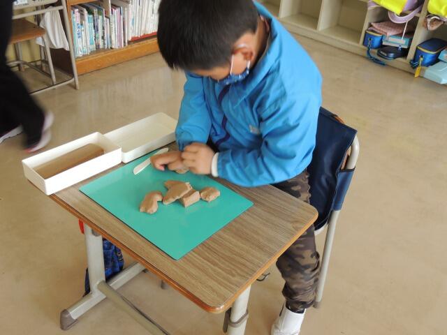 1年生になって初めての粘土をつかった造形遊び。袋から新しい粘土を出してこねます。そして、今日の課題は「すきなどうぶつ」と「すきなたべもの」からどちらかを選ぶ選択制。ぞうさん、タピオカミルクティー、ドーナッツにパンケーキ。ステーキをランチセットで作った児童もいました。3時間目でしたが、おいしそうな粘土の食べ物に刺激され、「給食、早く食べたーい!」という声も聞こえてきました。