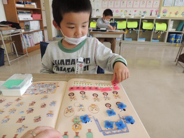 いろいろな動物の数を数えます。「犬はなんびきいるかな?おはじきを置いてみましょう。」上手に置けました。おはじきの数を数えてノートに数字を書きます。