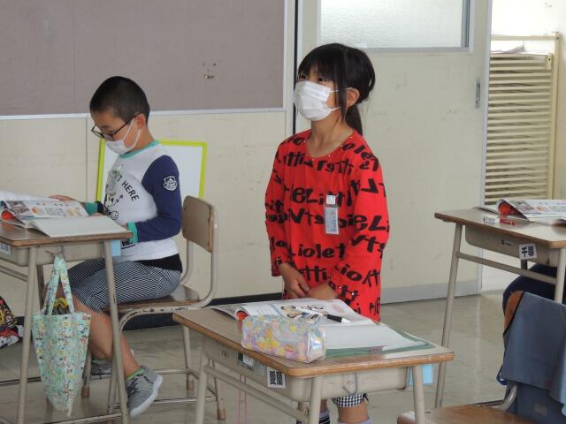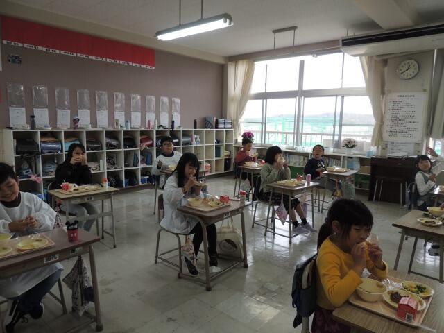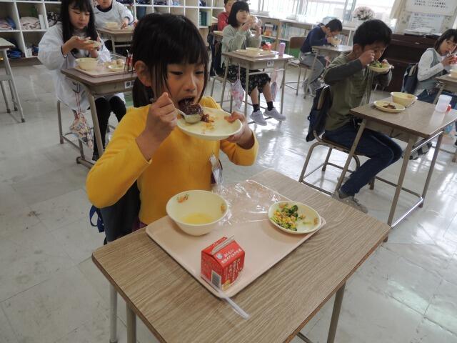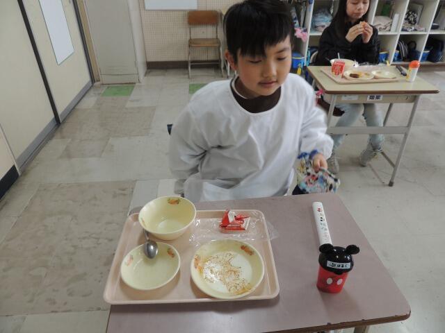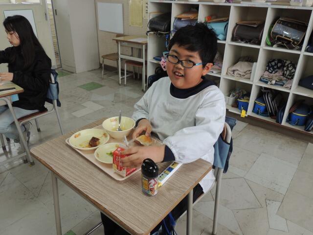 今日は週に一度のパン給食の日。メニューはデミグラスハンバーグ、花野菜のサラダ、コンソメスープでした。ハンバーグをパンに挟んで、ハンバーガーにして食べている子もいました。パンとご飯どっちが好きと聞くと、5対5の同点。「私はそばが好き!」と言う子も。「そんな君のそばにいたい。」・・・シーン。4年生も立派に黙食できました。