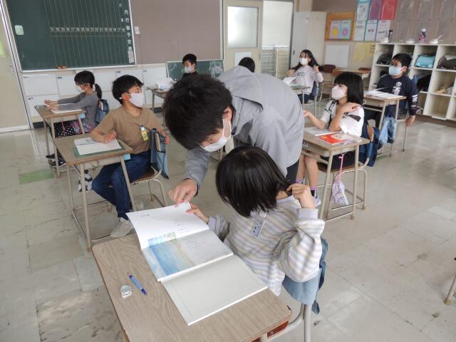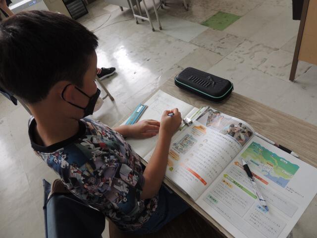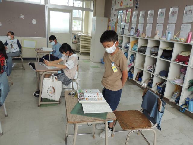 詩「水平線」を暗唱しています。「うーん、ここが難しいんだよね。」目をつぶって集中しています。一通り覚えると読み方を工夫しながら暗唱してみました。先生の「工夫して読みたいところに線を引きましょう。」の指示で、それぞれ教科書に線を引きました。