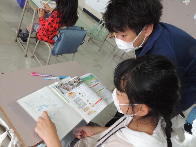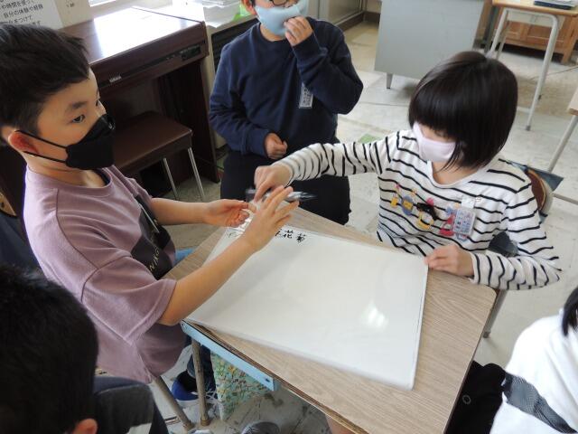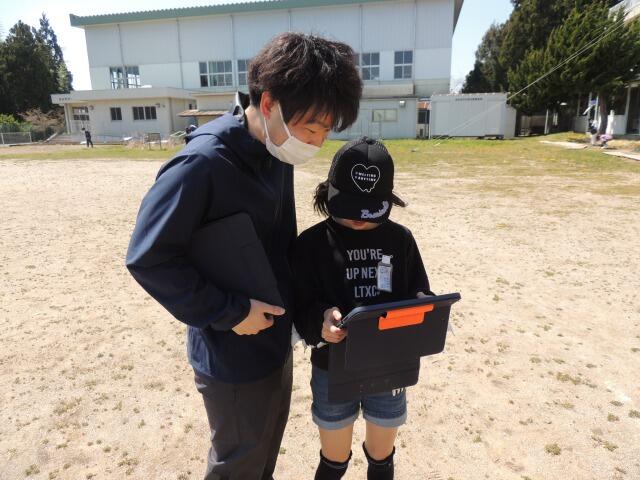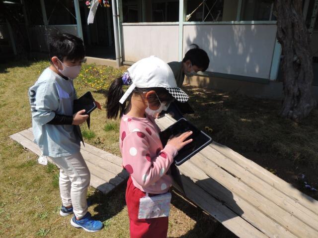 日差しは暖かいのですが、風がちょっぴり冷たい校庭で4年生が春の動物をさがしていました。手にはタブレット・・・・と思いきや、ノートの子も。「私のタブレットの充電が切れていました。」なるほど、タブレットにも弱点はあります。ダンゴムシやカナヘビの画像をゲット!教室に戻ってまとめます。軒下では、児童館のぬいぐるみがひなたぼっこしていました。