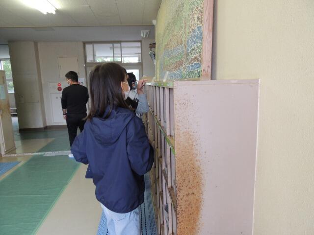 清掃についての学習。学校の教室、水飲み場、昇降口の汚れについて、タブレットで写真を撮りながら確認しました。高いところや低いところに砂ぼこりやゴミを見つけたり、水飲み場では、水垢やカビを見つけたりしました。今後、掃除の仕方について学習します。
