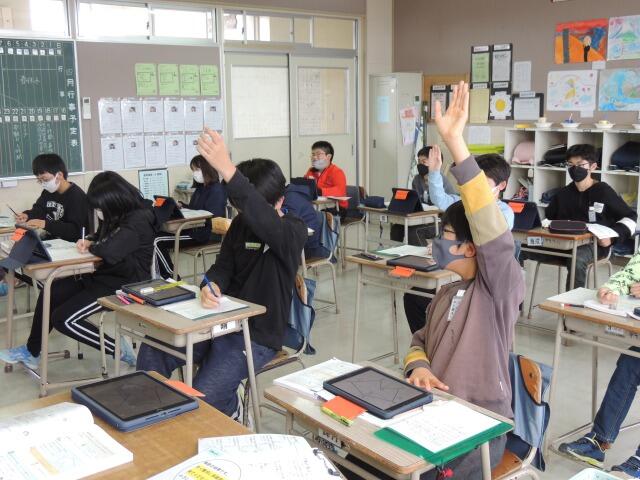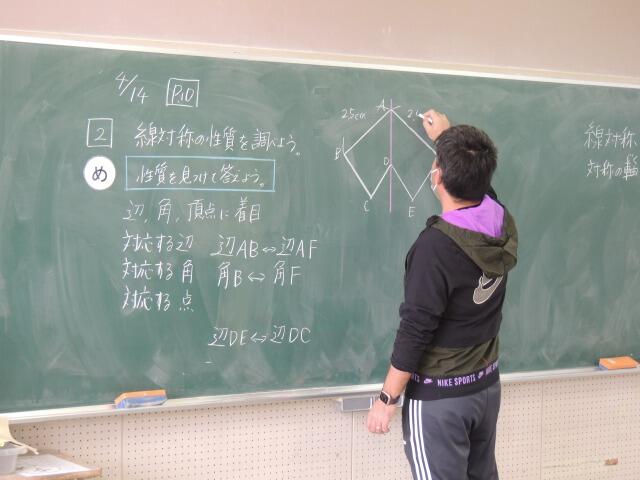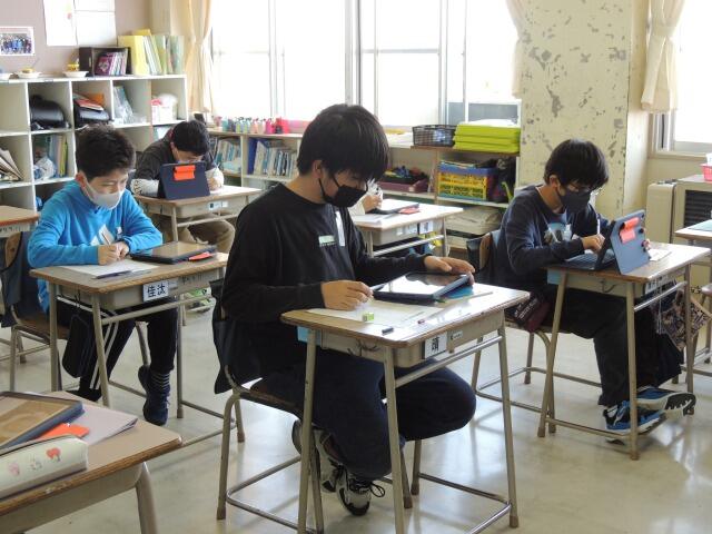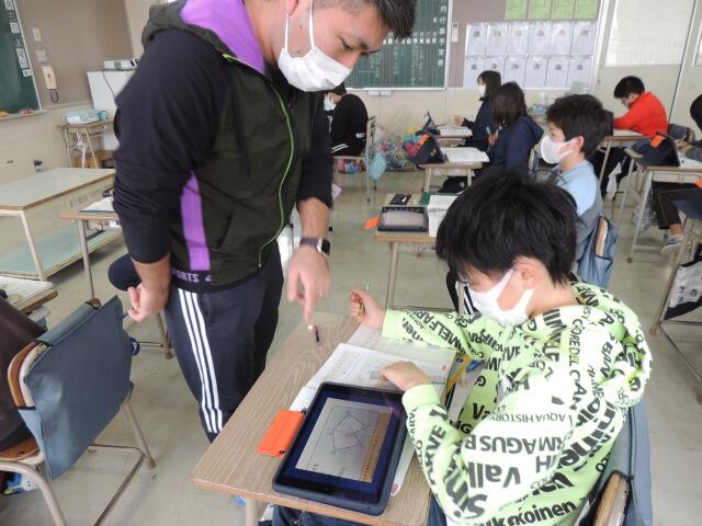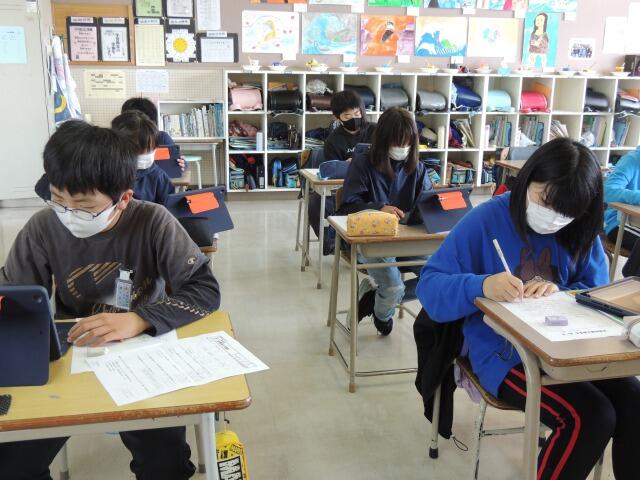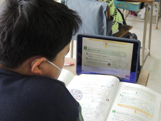 図形「線対称なかたち」の性質を学習する授業です。机の上には教科書、ノートにタブレット。教科書の図形を確認する際に、先生が図を配信して、みんなで確かめます。発表では、「対応する辺や角の大きさは全て等しくなります。」と算数的な言葉を使って発表していました。さすが、6年生!隣の友達と確認しながら、学び合う姿も見られました。
