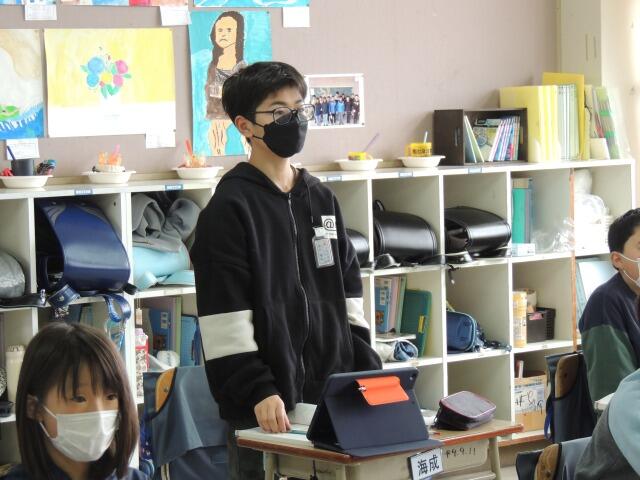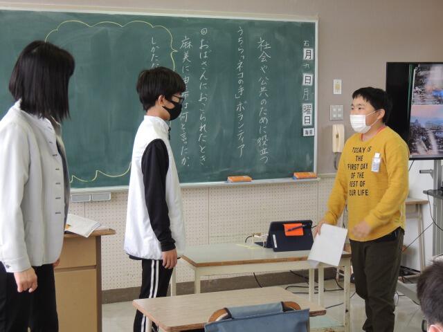 担任の先生が出張のため、教頭先生に道徳の授業をしていただきました。今回のテーマは「勤労、公共の精神」阪神淡路大震災の際に小学生がボランティアをした話が教材です。東日本大震災の記憶が無い子どもたちに気仙沼や大島の様子を伝え、被災した人の気持ちやボランティアに取り組む小学生の気持ちをワークシートに書かせました。考えたことを発表したり、ロールプレイングしたりしながら、ボランティアについてしっかり考えた1時間でした。
