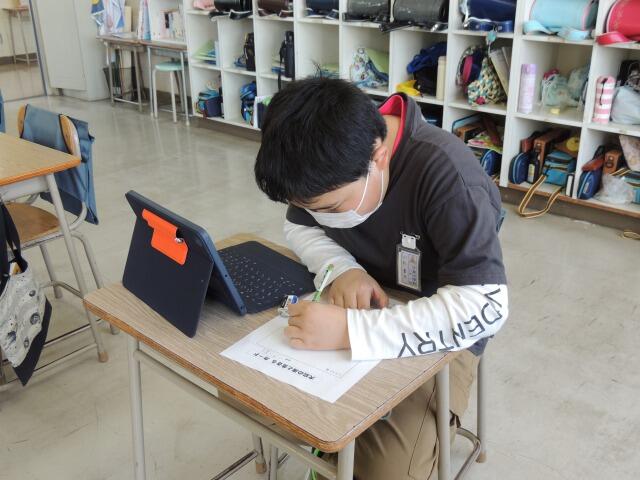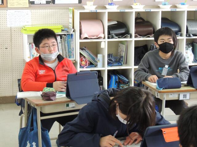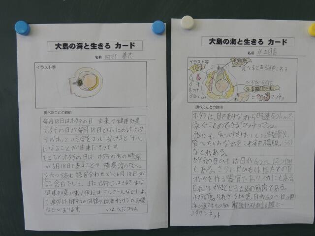 大島小学校では総合的な学習の時間で海洋教育に取り組んでいます。今日はホタテや海についての知識をインターネットで収集します。「できるだけ友達が知らなさそうなことを見つけてまとめる」のが今日のめあてです。「ホタテの目について」や「貝殻が消臭材として利用されること」、「ホタテの日の由来」、「時速50kmで泳ぐこと」等しっかり情報収集しています。最後に、友達が見つけたことに「へえ、そうなんだ!」と興味を示しながら調べた内容について交流しました。