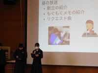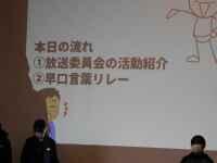 1月19日(月)の朝に、放送委員会による生徒集会が行われました。この集会では、放送委員会の活動の紹介やお昼の放送で流れる音楽と食事の食べる速さについての話題やリクエストの募集についてのお知らせがありました。また、活舌をよくするための早口言葉リレーを6グループで競うレクリエーションを行いました。ちょっと照れくさそうにしながらも笑顔を見せて取り組んでいました。