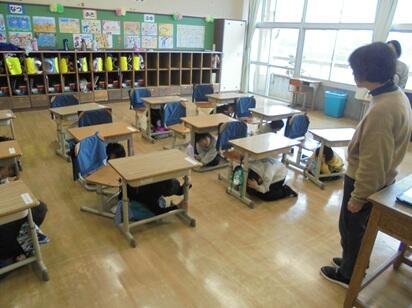 昨日入学したばかりの1年生は、担任と一緒に教室内で緊急時の身の守り方を勉強しました。担任から指示された3つのこと(「机の下では頭を守ること」「指示がよく聞こえるように静かにすること」「机が動かないように机の脚をしっかり握っておくこと」)を意識し、きちんと避難行動をとることができました。