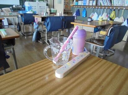 お箸と歯磨きセットがずらり。次の活動(給食の準備)を見据え、担任と一緒に準備を整えてから体育の学習に向かったのがすぐに分かりました。
