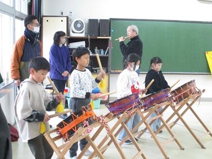 続いて2年生の子供たちも和太鼓の前に立ち、保存会の方が奏でる笛の音色に合わせてリズムを打つことに挑戦しました。地域の方に優しく教えていただきながら、2年生の子供たちはどうすれば力強く響く音色になるのか、かっこよく演奏するにはどうしたらよいのかを考えて練習に取り組みました。