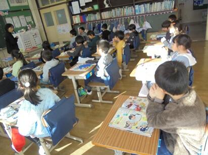 【1年生】図画工作科の作品づくりのポイントを担任と確認し、頭の中で自分が創りたい作品のイメージを広げていました。仕上がった友達の作品を鑑賞するときの大切な約束もしっかり確認することができたようです。