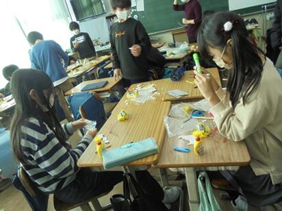 【6年生】はさみやカッターを使わずに発泡スチロールを自分の好きな形に切り分けています。子どもたちが手に持っているのは蓄電したコンデンサーにつないだ電熱線です。どんな仕組みで発泡スチロールが切れる(溶ける)のかについてはお子様に尋ねてみてください。