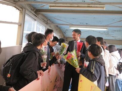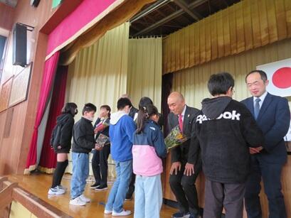 雨模様のため見送りは屋内で行いましたが、子供たち全員が一つになり、職員を温かく見送ることができました。家族の皆さんに準備していただいた花束や自分で書いた手紙を手渡しながら、感謝の気持ちを述べる子供たちの姿が印象的でした。