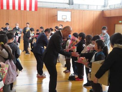 花道の先では、卒業した6年生が職員の到着を今か今かと待っていました。自分たちに卒業証書を手渡してくださった校長先生との別れ、本気になって授業をしてくれた先生との別れ、親身になって心配してくれた先生との別れ、そして…最初の担任と最後の担任との別れ。6年生の子供たちの心が揺さぶられる1日になったことは間違いありません。