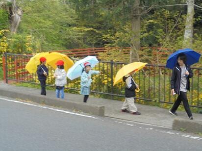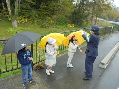 指導員の方からは、登下校中はランドセルも傘も身体の一部となることについて丁寧に教えていただきました。横断歩道の前でぴたっと止まったとき、自分がさしている傘が道路にはみ出してしまっていることにハッとする1年生、2年生がたくさんいました。活動の様子を見守っていた私たち職員にとっても、街頭指導での声掛けのポイントを学ぶ大切な機会となりました。
