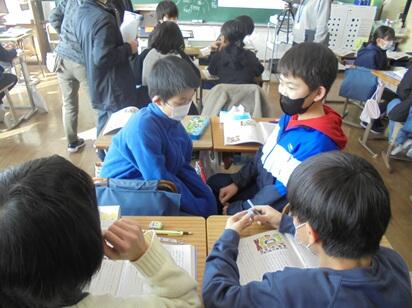 多目的室の中では、グループごとにヘッドホンを付けた友達と口の動きやジェスチャーで意思疎通を図る体験活動を行いました。いつもより大きく口を動かしたり、身振り手振りを加えながら大きな声を出したりし、自分の思いを相手に伝えようとする子供たちの姿が印象的でした。