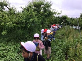朝、何気なく校舎前の生け垣をみると、赤い帽子の子どもたちが何やら一生懸命作業をしています。何をしているのでしょうか。