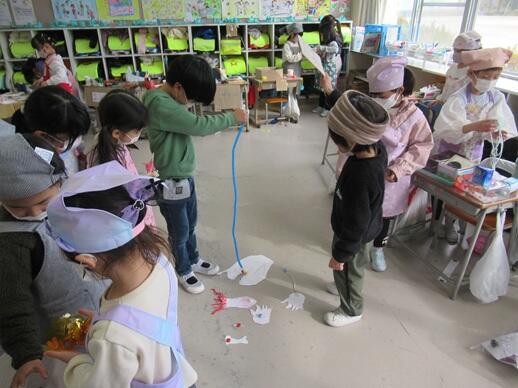 朝、何気なく校舎前の生け垣をみると、赤い帽子の子どもたちが何やら一生懸命作業をしています。何をしているのでしょうか。