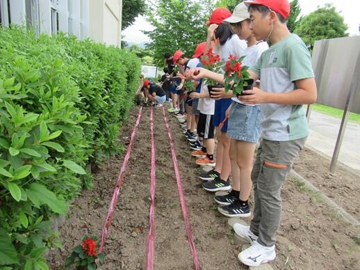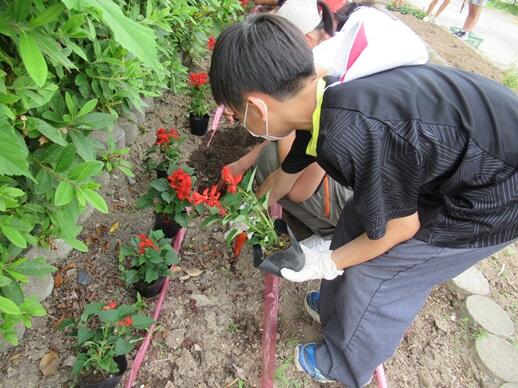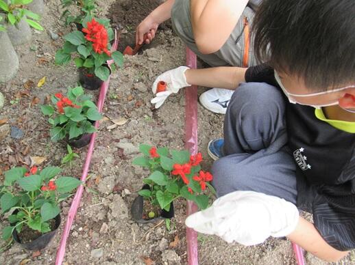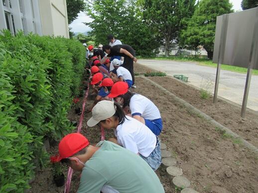 朝、何気なく校舎前の生け垣をみると、赤い帽子の子どもたちが何やら一生懸命作業をしています。何をしているのでしょうか。