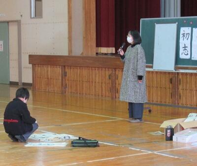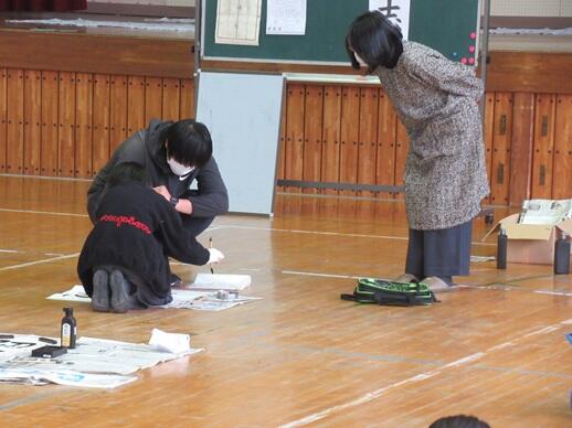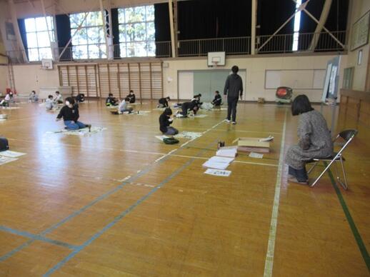 3~6年生を対象に、書きぞめに向けた習字教室を行いました。今回は6年生の授業の様子をお伝えします。講師には、地域で習字教室を開いていらっしゃる齋藤静雨先生をお迎えしました。子どもたちは課題の字形や筆運び、文字の中心や余白の取り方などを丁寧に教えていただき、一画一画に気持ちを込めて練習しました。先生が近くで助言すると、子どもたちはすぐに書き直し、作品がみるみる整っていきます。体育館の広い場所で集中して取り組む姿から、上学年としての意欲と成長が感じられました。本番に向けて、今日の学びを生かして仕上げていきます。