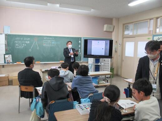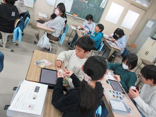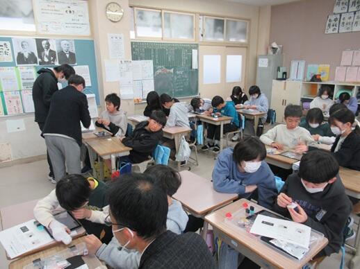 6年生が、MESH(メッシュ)アプリを使ったプログラミング学習に取り組みました。講師には、気仙沼市教育委員会の学力向上マイスター教員をお招きし、タブレットを活用しながら学習を進めました。今回は、LEDランプと人感センサーを組み合わせ、「人が近づいたら光る」「人が近づいたら声を出す」「離れたら消える」といった動きなどをプログラムでつくる活動に挑戦しました。子どもたちは、ブロックを組み合わせるように条件を設定し、試行錯誤しながら調整していきます。思い通りに動いた瞬間には「お、光った!」「お、消えた!」と歓声が上がり、教室は大きな盛り上がりを見せました。友達同士で画面を見せ合ったり、操作プログラムを一緒に考えたりする姿も多く見られ、協働的に学ぶよさが発揮された授業となりました。