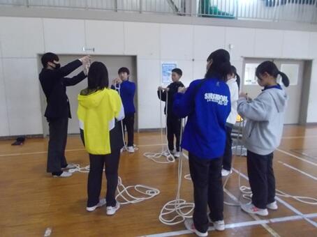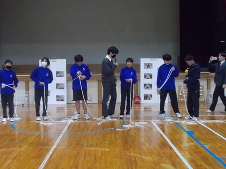 この授業は気仙沼向洋高校3年生の課題研究の一環で、中学生にロープワークを通して、
