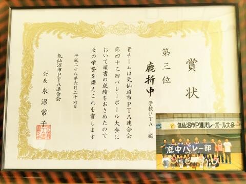 6月26日(日),気仙沼市総合体育館にて,気仙沼市PTAバレーボール大会が開催されました。鹿折中PTAチームは大健闘の末,第3位でした。この日を迎えるに当たって,前年度から鹿折小PTAの皆さんや,有志で集まっていただいた方々と練習を重ねてきました。特に,中島厚生部長をはじめ,部員の皆様には,大会当日はもちろんのこと練習場所の確保や差し入れ等,多くのご協力をいただき,ありがとうございました。なお,大会翌日から来年度に向けて,毎週月曜日19時より鹿折中学校体育館にて練習しておりますので,皆様のご参加をお待ちしております。