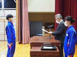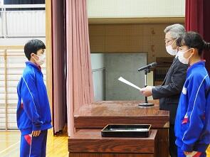本日,3月22日(金),修了式を行いました。本年度最後の授業日,1時間目に修了式を行い,掃除,学級活動の後,下校です。修了式では,写真のように,各学級の代表に修了証を渡しました。また,1学年,2学年の代表生徒が,今年度を振り返りながら次年度に向けての抱負を述べました。