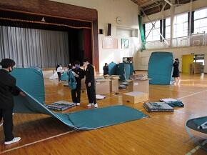 今日は,気仙沼市の津波総合防災訓練の日でした。本校でも,2つの訓練を実施しました。1つは,宮北バス様と合同のスクールバス防災訓練でした。スクールバス乗車時に大きな地震があった場合を想定したものでした。宮北バスの運転手さんの他,市教委の担当者も乗車して体験しました。学校到着後は,乗車生徒と宮北バスの乗務員さんで振り返りを行いました。2つ目は,避難所初期設営訓練です。9時3分に大津波警報が出されたとの放送を受け,目標時間20分で避難所設営に取りかかり,18分で設営できました。その様子は,地域の方にも見ていただきました。今日の訓練の様子は,ミヤギテレビ,河北新報,三陸新報の皆様にもご覧いただきました。
