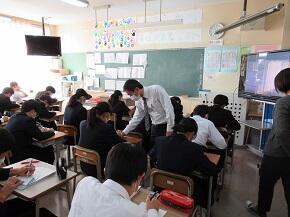 1年生の学級活動では,タブレットを使って高校調べを行っていました。生徒たちは,教え会い,そして確認し合いながら,上手にタブレットを使って積極的に情報収集をしていました。