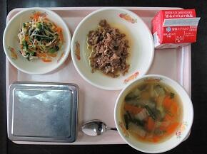 11月の給食は「すくすくみやぎっ子,みやぎのふるさと食材月間」です。今日の給食は,ごはん,牛乳,そして黒毛和牛を使った焼肉(セルフビビンバ),ナムル(セルフビビンバ),ふか団子スープでした。いつもより,おかわりをする人が多かったかもしれません。とてもおいしくいただきました。