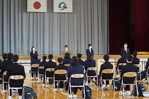 本日朝の時間に,生徒集会が行われました。最初に,先日行われたソフトテニス大会の表彰を行い,その後,各委員会の委員長から活動報告と今後の活動について説明がありました。「目に見える活動」の実践をどの委員会も心掛けています。委員会活動の盛んな学校を目指し,生徒たちは活動しています。