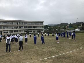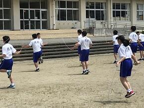 体育の授業では,準備運動のあと,昨年度まではペアで補強運動を行っていましたが,今年は,人との距離をとって活動することから,補強運動に縄跳びを取り入れています。1年間継続して行っていく予定です。