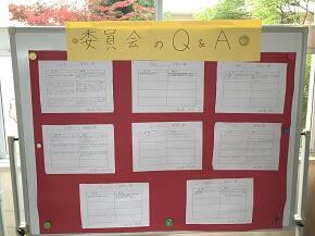 昇降口前のホワイトボードに,先日行われた生徒総会の写真や質問とその回答が掲示されています。特に,どのような質問が出て,どのような回答があったのかを振り返る事ができます。素晴らしい取り組みだと思います。