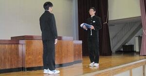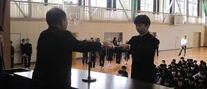 1週間前の1月12日(土)に吹奏楽部の3人は,打楽器3重奏「ケルベロス・ドラムス」を仙台市のイズミティーの大ホールで披露してきました。アンサンブルコンテストの県大会です。昨年,12月の地区大会で金賞をいただいた演奏に更に磨きを掛け,音楽性を高めて臨んだ県大会でした。結果は,銅賞ということでしたが,とてもいい演奏ができたようです。それが一番です。「ケルベロス」とはギリシャ神話に出てくる犬の怪物で,三つの頭をもつ猛犬のことです。この曲は,その名の通り3人が入り乱れて打楽器を演奏するもので,最初に聞いたときはとてもびっくりした難しい曲です。地区大会を経て,3人は先生の指導を受けて更に練習し,曲を自分たちのものにしてきた歩みは立派です。よく頑張りました。県大会に出場して演奏した大きな経験を今後の目標に生かしてほしいものです。期待します。また,県大会に出発する時には,学校に来ていた男子卓球部,女子ソフト部の生徒の皆さんが見送りをしてくれました。ありがとう。