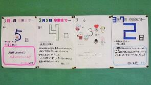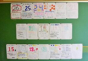 ある学級の側面の壁には,左上のような掲示物がありました。一番上の段には,係や班所属,2段目には各種の通信,3段目には話合いで使った付箋紙,4段目には話合いのテーマが書かれていました。とてもよくできています。