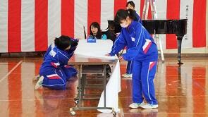 5月20日(月)の午後,今年度の生徒総会が行われ,生徒たちは年間活動テーマなどを決定しました。いよいよ鹿折中学校72回目の生徒会の歩みが始まります。開会に当たり,生徒会の歌を全員で斉唱しました。そして,「学校の主人公は生徒なのだから,生徒が自分たちの学校生活に主体的に取り組み,責任を持つことは当然です」と校長先生からお話をされ,その活動例として,昨年の夏の甲子園大会を湧かせた秋田県立金足農業高校の「全力校歌」を動画で視聴しました。