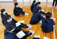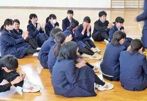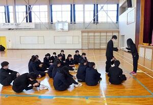 前半は体育館でウオーミングアップゲームやチームワークゲームを行い,みんなで協力をして課題を解決することをゲームを通して学びました。