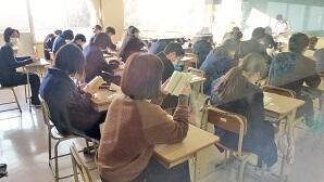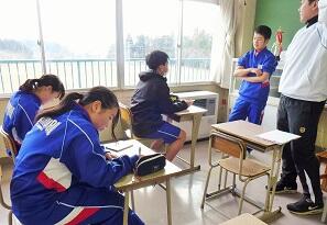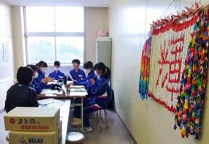 生徒の防災委員会では,毎月,防災標語を考えて決定し,校舎内に掲示して呼びかけています。各学年から意見を出し,その中で良いものを選んで決めている様子です。