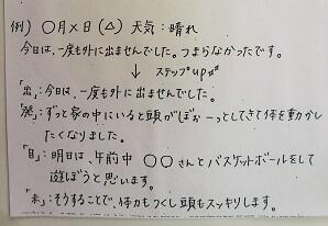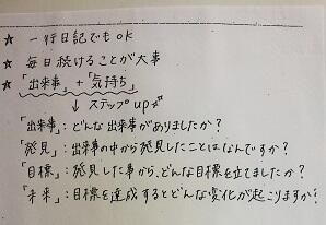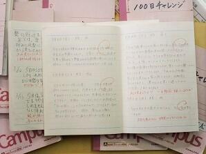 1年生の教室に行ってみると,なんだか大きなホワートボード(WB)が後の出入口のところにあったのです。こんなに大きいWBがあったかなあと思って,その中身を見てみると,3人の生徒のチャレンジノート(家庭学習ノート)のコピーが貼ってあり,コメントが書いてありました。これで家庭学習を生徒に工夫させ,効果的な学習の仕方を身に付けさせようとしているのでした。3人の生徒の良さが説明されています。先生が書いたものでしょうか?生徒たちが書いたものでしょうか?それぞれの良さが紹介されています。