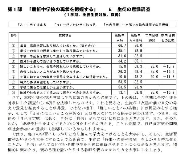 保護者の皆さんは,既にご存じの通り,この生活習慣に問題があることは昨年度の学校評価の結果から明らかなことでした。そして,生徒自身もそう感じており,私たち学校職員も問題視・不安視していることです。もし,これらの生活習慣が改善・向上したら,鹿折中生徒の①前向きさが高まり,②学力は向上し,②問題行動が減り,④健康が増進されることが期待できます。