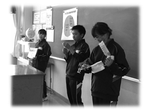 写真は男子生徒の視力測定の様子です。順番を待っている生徒が目をふさいで練習したり,答えを暗記しようとしているのが何かおかしい風景です。一生使わなければならない目ですから,各自で生活習慣を点検していきたいですね。また,前回お知らせした「むし歯」の治療もぜひお願いいたします。