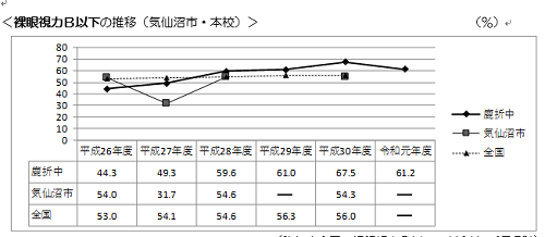 本校生徒は肥満傾向にあることは,以前に本校の健康課題としてお知らせしていましたが,今回特に話題となったのは「視力低下」でした。これは危機的な状態です。全校生徒の約3分の1に当る34名が,視力0.6以下(判定C・D)となり,受診勧告・視力矯正勧告となってしまいました。大変なことです。前回,視力を矯正しても半年後にはメガネが合わない状態になっている生徒もいるというのです。このような視力低下の背景を探らなければなりません。何かが作用しているものと思われます。ご家庭でもぜひ視力の問題を取り上げていただきたいと思います。