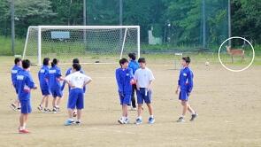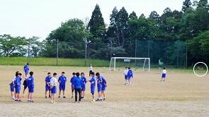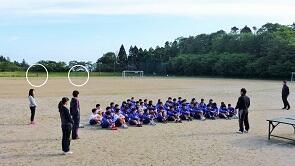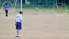 明日は陸上大会という日のことです。ひょっとしたら生徒たちを激励に来てくれたのかもしれませんね。それにしても,あまりに堂々としていて逃げないので,先生は生徒に危害が加わるのではないかと心配し,鹿と距離をとりながら,じっとその様子を観察していました。下の丸印の先生がそれです。陸上チームの監督を務める先生が,明日の大会での心構えや期待を話しているときも,遠くの方でそのお話を聞いていたようです。さっきの先生はまだ気を抜かず,用心をしています。それにしても,鹿がいても生徒は平然としています。鹿と共生する中学校なのです。先生,ご苦労様でした。