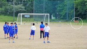 上の写真は6月12日(火)に撮影したものです。白い丸のところに鹿がいるのですが,お分かりでしょうか。この日は午前中から校庭に鹿が来ていたと生徒は言っていましたが,夕方,陸上大会の練習を行っているときにも鹿が校庭にいました。何やら生徒たちの練習に興味をもっているかのようなそぶりで,逃げもせず,しばらく校庭をうろついていたのです。こんなことって,あるのでしょうか。