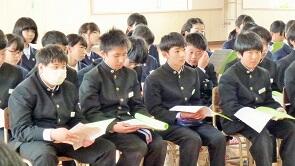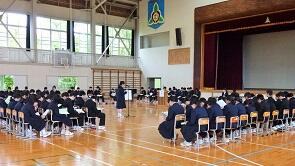 5月20日(月)の午後,今年度の生徒総会が行われ,生徒たちは年間活動テーマなどを決定しました。いよいよ鹿折中学校72回目の生徒会の歩みが始まります。開会に当たり,生徒会の歌を全員で斉唱しました。そして,「学校の主人公は生徒なのだから,生徒が自分たちの学校生活に主体的に取り組み,責任を持つことは当然です」と校長先生からお話をされ,その活動例として,昨年の夏の甲子園大会を湧かせた秋田県立金足農業高校の「全力校歌」を動画で視聴しました。
