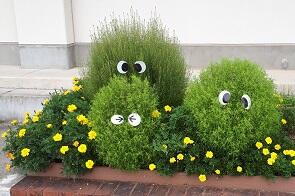 しかしよく見ると,可愛らしい「もじゃもじゃの怪物」も登場していますね。これは去年はありませんでした。「コキア」とう植物らしいのです。別名「ほうき草」とも言われるそうです。アニメ「魔女の宅急便」に出てくる,魔女の空飛ぶほうき,あれは,このコキアから作るものなのだそうです。用務員さんが,可愛らしい目玉をつけてくれたので,生徒を見つめたり,ウインクをしたりしているように見えますね。ちょっと楽しい気持ちになります。コキアは秋には真っ赤に紅葉するそうです。楽しみです。