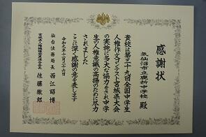 一つは人権作文コンテストで3年生の及川さんが奨励賞を頂戴しました。人権作文は社会科の学習の一環として夏休みの応募課題としています。一口に人権といっても様々な人権の課題があります。それらについて,テーマを絞って自分の考えをまとめて書いた作文です。及川さんには,仙台法務局気仙沼支所長様や人権養護委員連絡協議会長様に学校へおいでいただき,校長室で賞状や記念品が手渡されました。おめでとうございます。なお,この作文コンテストへの永年の協力に学校に対しても感謝状をいただきました。ありがとうございました。