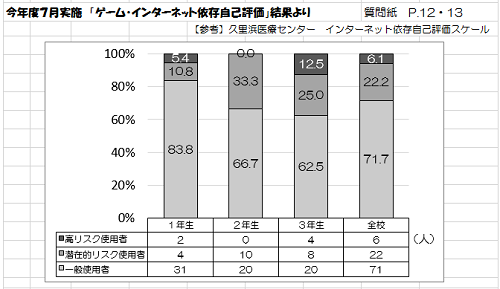 本校では「鹿折中学校版ゲーム・インターネット依存自己評価シート」を養護教諭が作成し,1学期末に全校生徒に自己評価をしてもらいました。これは,いくつかの質問に答えてもらって,ゲームやインターネットへの「依存傾向がどのくらいあるか」を評価するものです。そして,その結果は下のようになりました。