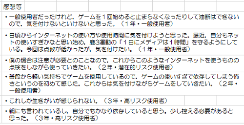 自己評価の結果によって,依存傾向の強い「①高リスク使用者」と,潜在的にリスクを抱えている「②潜在的リスク使用者」,依存はしていないと思われる「③一般使用者」に結果を集約すると,上のような結果が出ました。一口で言えば,全校生徒の約3割がゲームやネットへの「依存リスク」を抱えているという結果です。学年が上がるとその傾向が強くなっています。実は,本校職員からは普段の様子から見るとリスク保有者はもっと多いのではないかという感想が聞かれました。生徒の心身の健康,やる気や前向きさ,心の柔軟性や対人関係,学習成績等に善し悪しに関わる重要な問題だと捉えています。学校保健委員会では,保護者間で協力して,一緒になって指導することも必要ではないかというご意見もいただきました。下には生徒たちの感想をいくつか紹介します。