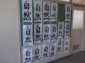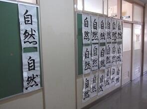また,本日,冬休みの課題であった毛筆の展示も行いました。2年生の課題は「自然」でした。